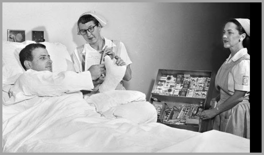 I’ll skip the magazine this time and grab a pack of Camels instead. Back in 1950, handing out free treats while delivering magazines was pretty common. The person in the photo seems nice enough—maybe the candy stripers will soon arrive with a tasty lunch tray to brighten the day!